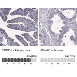 - Immunohistochemistry-Paraffin: STMND1 Antibody [NBP2-57594] - Staining in human fallopian tube and prostate tissues using anti-STMND1 antibody. Corresponding STMND1 RNA-seq data are presented for the same tissues.