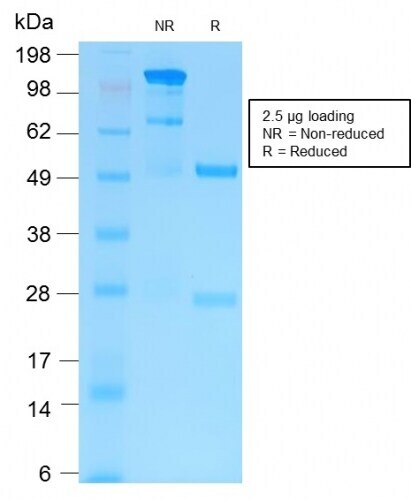 - SDS-PAGE Analyis Purified MMP9 (Matrix Metalloproteinase 9) Recombinant Monoclonal Antibody (Product # 4318-RBM5-P1). Confirmation of Purity and Integrity of Antibody.