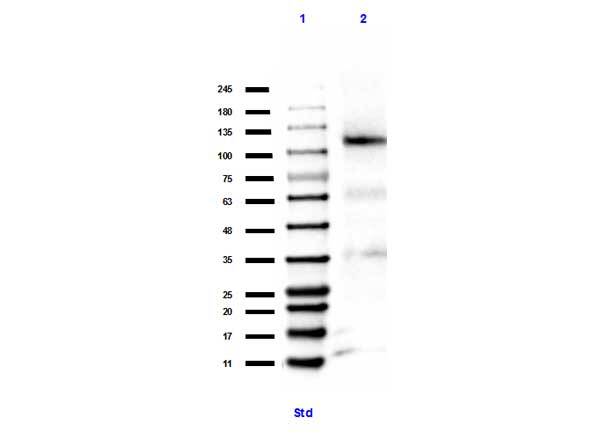 - Western Blot of rabbit anti-Retinoblastoma [Monomethyl Lys860] antibody. Lane 1: MW ladder (opal pre-stained). Lane 2: MOLT-4 WCL. Load: 35 ug per lane. Primary antibody: Retinoblastoma antibody at 1:1000 for overnight at 4°C. Secondary antibody: rabbit secondary HRP antibody at 1:70,000 for 30 min at RT. Block: BlockOut 30 min at RT. Predicted/Observed size: expect 106 kDa for Retinoblastoma protein.