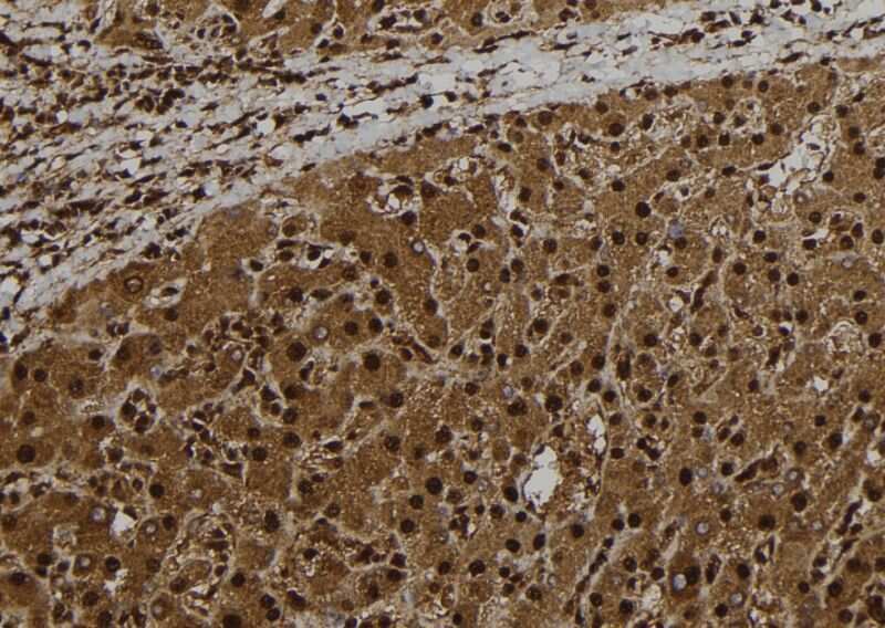 - Immunohistochemistry analysis of paraffin-embedded CT47 in human liver tissue. Antigen retrieval was performed using citrate buffer. Samples were blocked with blocking buffer (1.5 hr, 22°C), incubated with CT47 polyclonal antibody (Product # PA5-103332) using a dilution of 1:100 (1.5 hr, 22°C), followed by HRP conjugated goat anti-rabbit.
