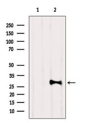 - Western blot analysis of CT47 in COS7 cell lysate (left lane: treated with blocking peptide). Samples were incubated with CT47 polyclonal antibody (Product # PA5-103332).