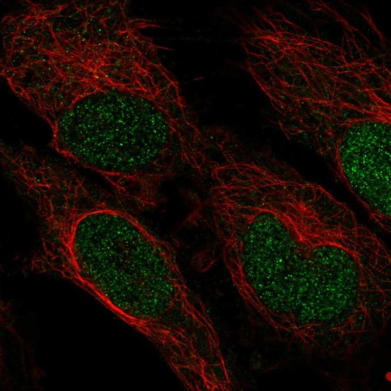 - Immunofluorescent staining of human cell line HeLa shows localization to nucleus.