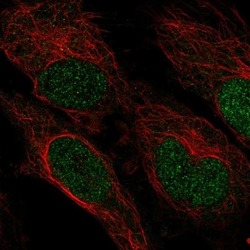- Immunofluorescent staining of ZNF594 in human cell line HeLa shows localization to nucleus. Samples were probed using a ZNF594 Polyclonal Antibody (Product # PA5-66901).