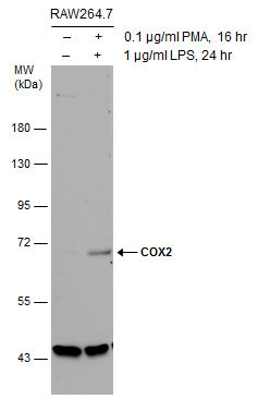 - Untreated (¡V) and treated (+) RAW264.7 whole cell extracts (30 ?g) were separated by 7.5% SDS-PAGE, and the membrane was blotted with COX2 antibody [C3], C-term (GTX100656) diluted at 1:1000. The HRP-conjugated anti-rabbit IgG antibody (GTX213110-01) was used to detect the primary antibody.