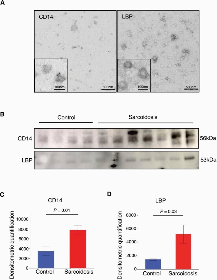 - Fig. 4. Expression of CD14 and LBP in serum EVs. (A) Transmission electron microscopy images showing the CD14 and LBP expression in EVs isolated from patients with sarcoidosis, labelled with primary antibody and anti-IgG gold-labelled secondary antibody. (B) A representative immunoblot comparing CD14 and LBP in serum EVs of healthy control subjects and patients with sarcoidosis. Data are representative of three independent studies with similar results. (C and D) Densitometric analyses of the immunoblot results for CD14 (C) and LBP (D) in Fig. 4(B) . Error bars indicate mean +- SEM.