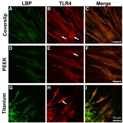 - Figure 6 Immunocytochemical evidence for LBP and TLR4 in osteoblasts under physiological culture conditions. ( A ) Coverslip LPB; ( B ) Coverslip TLR4; ( C ) Coverslip Merge; ( D ) PEEK LBP; ( E ) PEEK TLR4; ( F ) PEEK Merge; ( G ) Titanium LBP; ( H ) Titanium TLR4; ( I ) Titanium Merge.