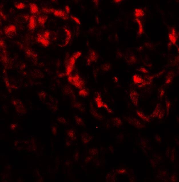 - Immunofluorescence of Beclin 2 in human lung carcinoma tissue with Beclin 2 Polyclonal Antibody (Product # PA5-72828) at 20 µg/mL.