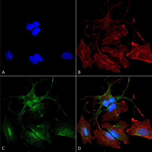 - Immunocytochemistry/Immunofluorescence analysis using Rabbit Anti-Beclin 2 Polyclonal Antibody. Tissue: Neuroblastoma cell line (SK-N-BE). Species: Human. Fixation: 4% Formaldehyde for 15 min at RT. Primary Antibody: Rabbit Anti-Beclin 2 Polyclonal Antibody at 1:100 for 60 min at RT. Secondary Antibody: Goat Anti-Rabbit ATTO 488 at 1:200 for 60 min at RT. Counterstain: Phalloidin Texas Red F-Actin stain; DAPI (blue) nuclear stain at 1:1000, 1:5000 for 60 min at RT, 5 min at RT. Localization: Cytoplasm. Magnification: 60X. (A) DAPI (blue) nuclear stain (B) Phalloidin Texas Red F-Actin stain (C) Beclin 2 Antibody (D) Composite.