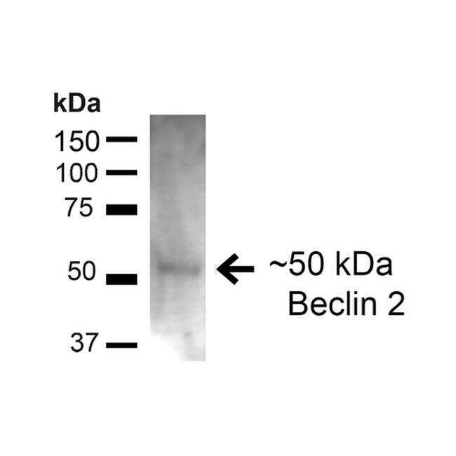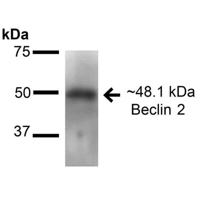 - Western blot analysis of Beclin 2 in rat liver with 20 µg of sample. The sample was incubated with Beclin 2 polyclonal antibody (Product # PA5-77774) using a dilution of 1:200 (1 hour at RT), and followed by Goat Anti-Rabbit HRP (1 hour at RT) at a dilution of 1:2000 and ECL development (6 min at RT). Samples were arranged as follows: Lane 1: MW Ladder, Lane 2: Rat Liver.
