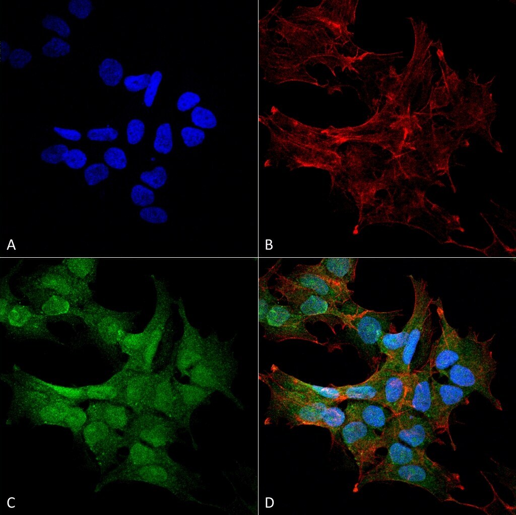 - Immunofluorescent analysis of Beclin 2 in human neuroblastoma cell line (SK-N-BE). Sample was fixed with 4% formaldehyde (15 min at RT), incubated with Beclin 2 polyclonal antibody (Product # PA5-77774) using a dilution of 1:100 (1 hour at RT), and followed by Goat Anti-Mouse 488, Phalloidin Texas Red and DAPI secondary antibody at a dilution of 1:200, 1:1000 (60 min at RT) and 1:5000 (5 min at RT). Images are shown as follows: (A) DAPI (blue) nuclear stain B) Phalloidin Texas Red F-Actin stain C) Beclin 2 Antibody D) Merged image. Magnification: 60x.