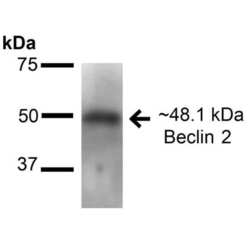 - A 1:1,000 dilution of PA5-77774 was sufficient for detection of Beclin2 on rat liver lysates using Goat anti-rabbit IgG:HRP as the secondary antibody.|Predicted molecular weight at approximately 48.1kDa. Observed bands in the 50-55kDa range, varied by lysates.