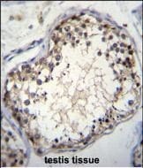 - Immunohistochemistry analysis of OVOS2 in formalin fixed and paraffin embedded human testis tissue. Samples were incubated with OVOS2 polyclonal antibody (Product # PA5-71560) followed by peroxidase conjugation of the secondary antibody and DAB staining. This data demonstrates the use of this antibody for immunohistochemistry. Clinical relevance has not been evaluated.