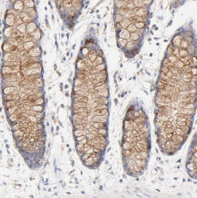 - Immunohistochemistry-Paraffin: FCGBP Antibody [NBP1-90462] - Staining of human rectum shows moderate positivity in mucus in glandular cells.