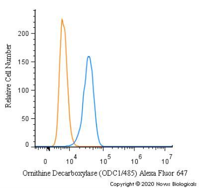 - Flow Cytometry: Ornithine Decarboxylase Antibody (ODC1/485) - Azide and BSA Free [NBP2-34700] - An intracellular stain was performed on K562 cells with Ornithine Decarboxylase [ODC1/485] Antibody NBP2-34700AF647 (blue) and a matched isotype control (orange). Cells were fixed with 4% PFA and then permeabilized with 0.1% saponin. Cells were incubated in an antibody dilution of 2.5 ug/mL for 30 minutes at room temperature. Both antibodies were conjugated to Alexa Fluor 647.