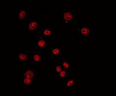 - Immunofluorescent analysis of ELOA3 in COLO205 cells. Samples were fixed with paraformaldehyde, permeabilized with 0.1% Triton X-100, blocked with 10% serum (45 min at 25°C) incubated with ELOA3 polyclonal antibody (Product # PA5-101331) using a dilution of 1:200 (1 hr, 37°C), and followed by goat anti-rabbit IgG Alexa Fluor 594 at a dilution of 1:600.