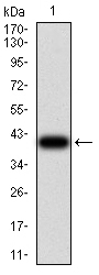 - Western blot analysis using SAG2 mAb against Toxoplasma gondii surface antigen 2B SAG2 (AA: 1-130) recombinant protein. (Expected MW is 39.3 kDa)