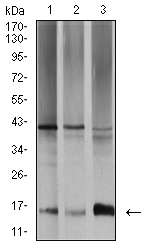 - Western blot analysis using SAG2 mouse mAb against SW480 (1), A431 (2), and K562 (3) cell lysate.