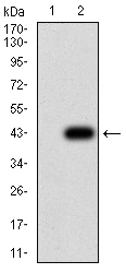 - Western blot analysis using SAG2 mAb against HEK293 (1) and SAG2 (AA: 1-130)-hIgGFc transfected HEK293 (2) cell lysate.