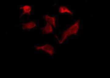 - Immunofluorescent analysis of OR6Q1 in HeLa cells. Samples were fixed with paraformaldehyde, permeabilized with 0.1% Triton X-100, blocked with 10% serum (45 min at 25°C) incubated with OR6Q1 polyclonal antibody (Product # PA5-102221) using a dilution of 1:200 (1 hr, 37°C), and followed by goat anti-rabbit IgG Alexa Fluor 594 at a dilution of 1:600.