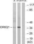 - Western blot analysis of extracts from Jurkat/HT-29 cells, using OR6Q1 Antibody. The lane on the right is treated with the synthesized peptide.