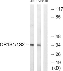 - Western blot analysis of lysates from Jurkat and HUVEC cells, using OR1S1/1S2 Antibody. The lane on the right is blocked with the synthesized peptide.