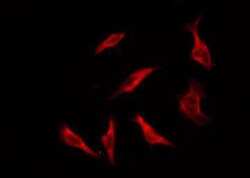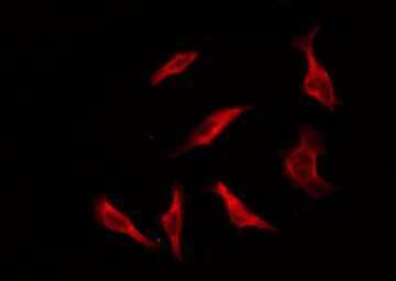 - Immunofluorescent analysis of OR1S1/OR1S2 in HT29. Samples were fixed with paraformaldehyde, permeabilized with 0.1% Triton X-100, blocked with 10% serum (45 min at 25°C) incubated with OR1S1/OR1S2 polyclonal antibody (Product # PA5-102167) using a dilution of 1:200 (1 hr, 37°C), and followed by goat anti-rabbit IgG Alexa Fluor 594 at a dilution of 1:600.