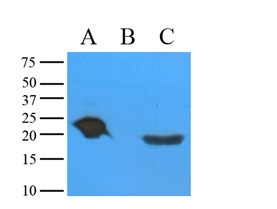 - Western blot analysis: Mouse eye extracts and recombinant proteins (Crystallin-alpha A and B) were resolved by electrophoresis, transferred to PVDF membrane and probed with anti-Crystallin alpha A (1:1000). Proteins were visualized using a goat anti-mouse secondary antibody conjugated to HRP and a DAP detection system. This antibody does not show cross-activity about Crystallin alpha B. Lane A: Crystallin-alpha A recombinant protein, Lane B: Crystallin-alpha B recombinant protein, Lane C: Mouse eye lysates