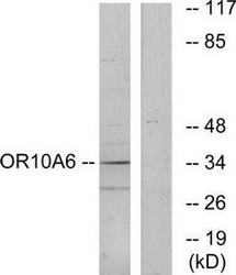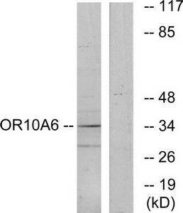 - Western blot analysis of extracts from A549 cells, using OR10A6 antibody.The lane on the right is treated with the synthesized peptide.