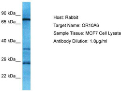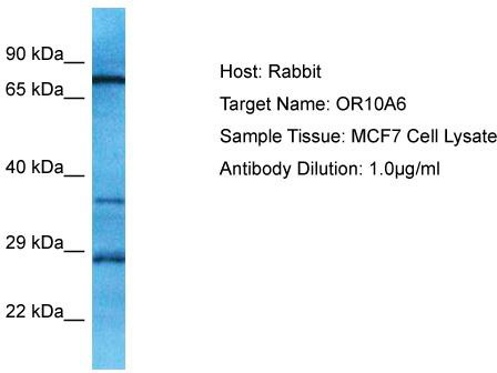 - Host: Rabbit; Target Name: OR10A6; Sample Tissue: MCF7 Whole Cell lysates; Antibody Dilution: 1.0ug/ml