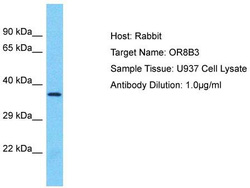 - Host: Rabbit; Target Name: OR8B3; Sample Tissue: U937 Whole Cell lysates; Antibody Dilution: 1.0 ug/ml