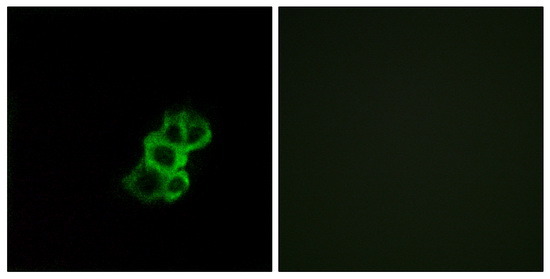 - Immunofluorescence analysis of MCF-7 cells, using OR8B4 antibody. The picture on the right is treated with the synthesized peptide.