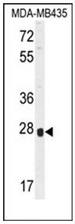 - Western blot analysis of OR8B4 Antibody (C-term) Cat.-No AP53106PU-NÂ in MDA-MB435 cell line lysates (35ug/lane). This demonstrates the OR8B4 antibody detected the OR8B4 protein (arrow).