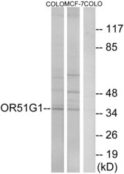 - Western blot analysis of lysates from COLO and MCF-7 cells, using OR51G1 Antibody. The lane on the right is blocked with the synthesized peptide.