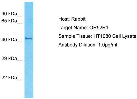 - Host: Rabbit; Target Name: OR52R1; Sample Tissue: HT1080 Whole Cell lysates; Antibody Dilution: 1.0ug/ml