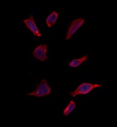 - Immunofluorescent analysis of OR52R1 in HeLa cells. Samples were fixed with paraformaldehyde, permeabilized with 0.1% Triton X-100, blocked with 10% serum (45 min at 25°C) incubated with OR52R1 polyclonal antibody (Product # PA5-104308) using a dilution of 1:200 (1 hr, 37°C), and followed by goat anti-rabbit IgG Alexa Fluor 594 at a dilution of 1:600.