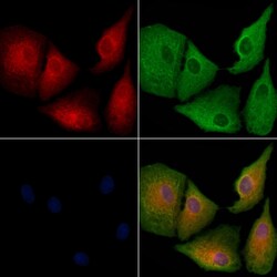 - Immunocytochemistry analysis of OR52R1 in A549 cells. The samples were fixed with PFA and permeabilized in 0.1% Triton X-100, then blocked in 10% serum for 45 minutes at 25°C. Samples were incubated with OR52R1 polyclonal antibody (Product # PA5-104308) and mouse anti-beta tubulin antibody for 1 hour at 37°C. An AlexaFluor594 conjugated goat anti-rabbit IgG(H+L) (Red) and an AlexaFluor488 conjugated goat anti-mouse IgG(H+L) (Green) were used as the secondary antibodies. The nuclear counter stain is DAPI (blue).