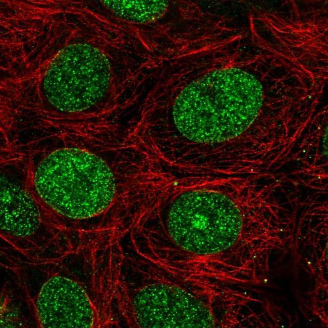 - Immunofluorescent staining of C2orf81 in human cell line MCF7 shows localization to nucleus and nucleoli. Samples were probed using a C2orf81 Polyclonal Antibody (Product # PA5-65901).