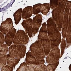 - Immunohistochemical staining of ARHGAP11B in human skeletal muscle shows strong cytoplasmic positivity in myocytes. Samples were probed using an ARHGAP11B Polyclonal Antibody (Product # PA5-64173).