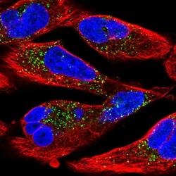 - Immunofluorescent staining of ARHGAP11B in human cell line RH-30 using an ARHGAP11B Polyclonal Antibody (Product # PA5-64173) shows localization to vesicles.