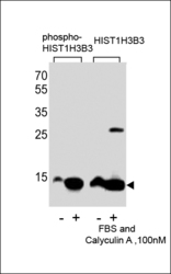 - "Western blot analysis of extracts from Hela cells,untreated or treated with FBS and Calyculin A ,100nM, using phospho-HIST1H3B3-S10(left) or HIST1H3B3 antibody(right)"