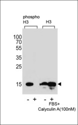 - "Western blot analysis of extracts from Hela cells,untreated or treated with FBS and Calyculin A,100nM, using phospho-H3-Ps10(left) or H3 antibody(right)"