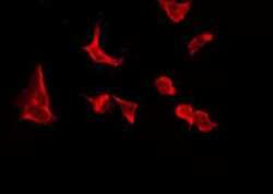 - Immunofluorescent analysis of OR4C16 in LOVO. Samples were fixed with paraformaldehyde, permeabilized with 0.1% Triton X-100, blocked with 10% serum (45 min at 25°C) incubated with OR4C16 polyclonal antibody (Product # PA5-102192) using a dilution of 1:200 (1 hr, 37°C), and followed by goat anti-rabbit IgG Alexa Fluor 594 at a dilution of 1:600.