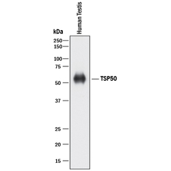 - Detection of Human TSP50 by Western Blot. Western blot shows lysates of human testis tissue. PVDF membrane was probed with 0.2 µg/mL of Goat Anti-Human TSP50 Antigen Affinity-purified Polyclonal Antibody (Catalog # AF2430) followed by HRP-conjugated Anti-Goat IgG Secondary Antibody (Catalog # HAF017). A specific band was detected for TSP50 at approximately 55 kDa (as indicated). This experiment was conducted under reducing conditions and using Immunoblot Buffer Group 1.