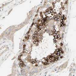 - Immunohistochemical staining of human testis shows strong cytoplasmic positivity in cells in seminiferus ducts.Antibody dilution:1:500. Image and statement courtesy of the Human Protein Atlas (HPA).