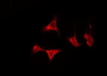 - Immunofluorescent analysis of OR5D13 in HeLa cells. Samples were fixed with paraformaldehyde, permeabilized with 0.1% Triton X-100, blocked with 10% serum (45 min at 25°C) incubated with OR5D13 polyclonal antibody (Product # PA5-102206) using a dilution of 1:200 (1 hr, 37°C), and followed by goat anti-rabbit IgG Alexa Fluor 594 at a dilution of 1:600.