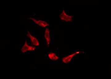 - Immunofluorescent analysis of OR8S1 in HT29. Samples were fixed with paraformaldehyde, permeabilized with 0.1% Triton X-100, blocked with 10% serum (45 min at 25°C) incubated with OR8S1 polyclonal antibody (Product # PA5-102232) using a dilution of 1:200 (1 hr, 37°C), and followed by goat anti-rabbit IgG Alexa Fluor 594 at a dilution of 1:600.