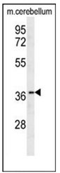 - Western blot analysis of OR10X1 Antibody (Center) ?in mouse cerebellum tissue lysates (35ug/lane). This demonstrates the OR10X1 antibody detected the OR10X1 protein (arrow).