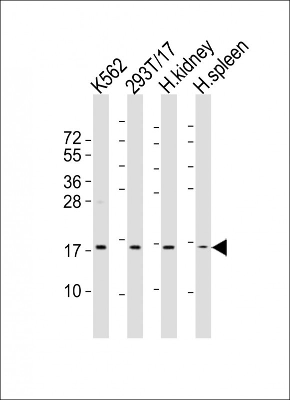 - All lanes : Anti-NFE4 Antibody at 1:2000 dilution Lane 1: K562 whole cell lysates Lane 2: 293T/17 whole cell lysates Lane 3: human kidney lysates Lane 4: human spleen lysates Lysates/proteins at 20 ug per lane. Secondary Goat Anti-Rabbit IgG, (H+L), Peroxidase conjugated at 1/10000 dilution Predicted band size : 19 kDa Blocking/Dilution buffer: 5% NFDM/TBST.