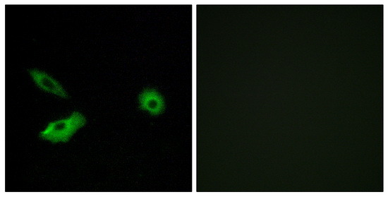 - Immunofluorescence analysis of A549 cells, using OR5AR1 antibody. The picture on the right is treated with the synthesized peptide.