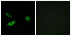 - Immunofluorescence analysis of A549 cells, using OR5AR1 antibody.The picture on the right is treated with the synthesized peptide.